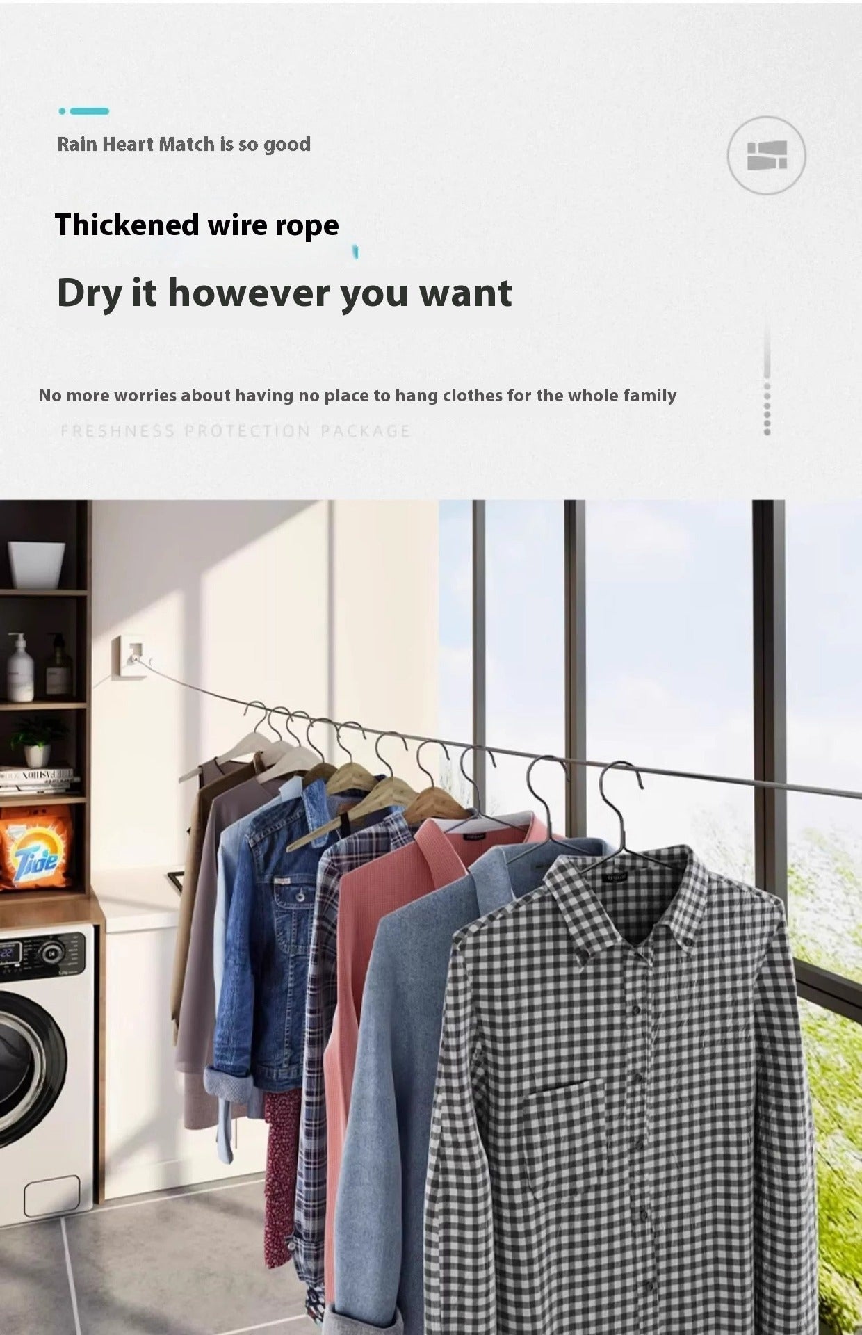 The MEILI HOME Telescopic Clothesline is a retractable, small-space-friendly clothes drying rope. It is perfect for drying clothing indoors in bathrooms, laundry rooms, balconies, or flats because it is made of a sturdy 1.5mm steel wire that reaches up to 4.2 meters.